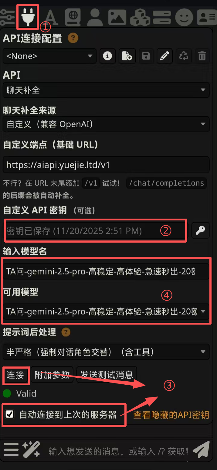 🔐 点击 API 连接菜单 🔑 输入 API 密钥(上一步复制的密钥, 如果还没有 API 密钥请先获取 API 密钥 ) ▶️ 点击连接,连接成功后状态会显示为有效 🔎 点击可用模型会出现模型列表,选择需要连接的模型