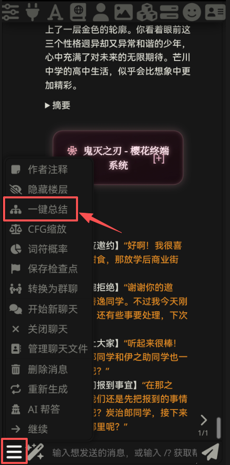 😺 打开对话页面,点击左下角三条杠,打开【一键总结】